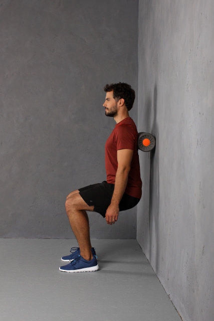 3. Bild 1: Kniebeugen Haltung. Rolle zwischen Wand und oberer Rückenmuskulatur geklemmt. Langsam mit dem Oberkörper hoch und runter bewegen. Bild 2: Seitlich an der Wand stehend. Leicht gebeugte Haltung. Seitliche Rückenmuskulatur langsam über die Rolle bewegen. Bild 3: Kniebeugen Haltung. Rolle zwischen Wand und unterer Rückenmuskulatur geklemmt. Langsam mit dem Oberkörper hoch und runter bewegen.