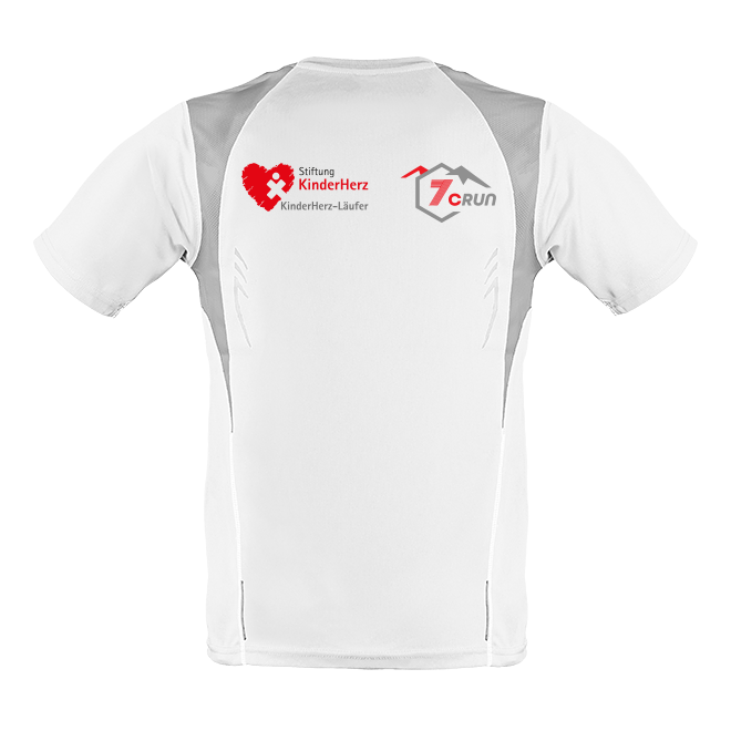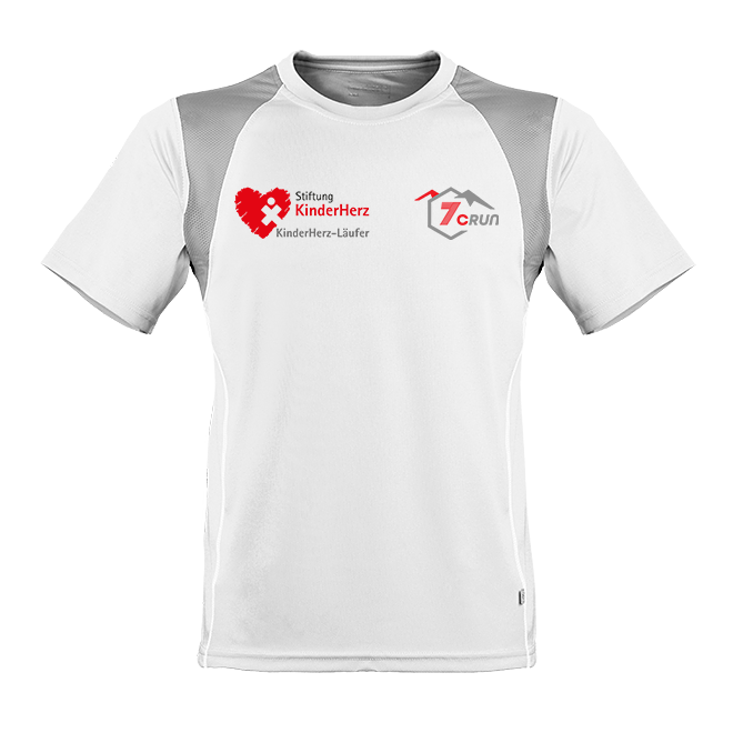 Sonderedtion Herren Marathon Shirt KinderHerz 7CRun weiß/silber mit individuellen Aufdrucken gestalten. Laufshirt 100% aus Funktionsmaterial. Hoher Tragekomfort durch Feuchtigkeitsregulierung, atmungsaktiv und schnelltrocknend, kontrastfarbige Mesh-Einsätze Reflexdruck im Rückenteil für mehr Sicherheit.